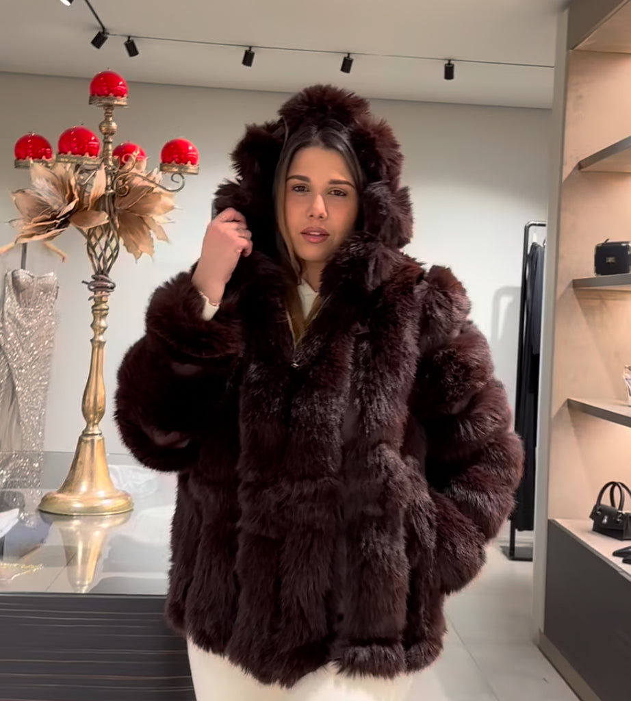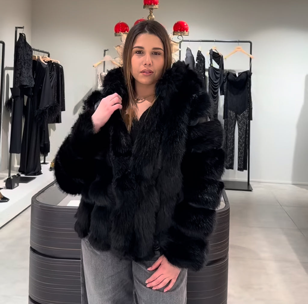 PELLICCIA CON CAPPUCCIO E LINEE VERTICALI