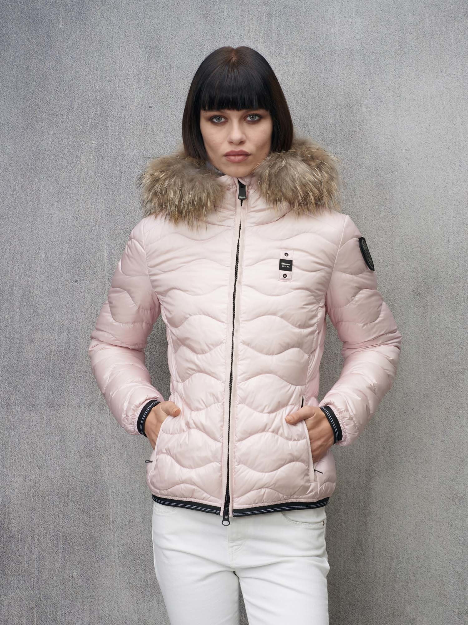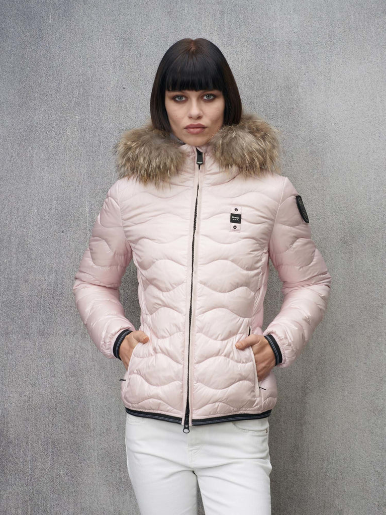 Piumino idrorepellente trapuntato ad onde orizzontali e con profilo del cappuccio in vera piuma. Capo iconico Blauer per con imbottitura naturale, calda e non ingombrante, per essere sempre alla moda.