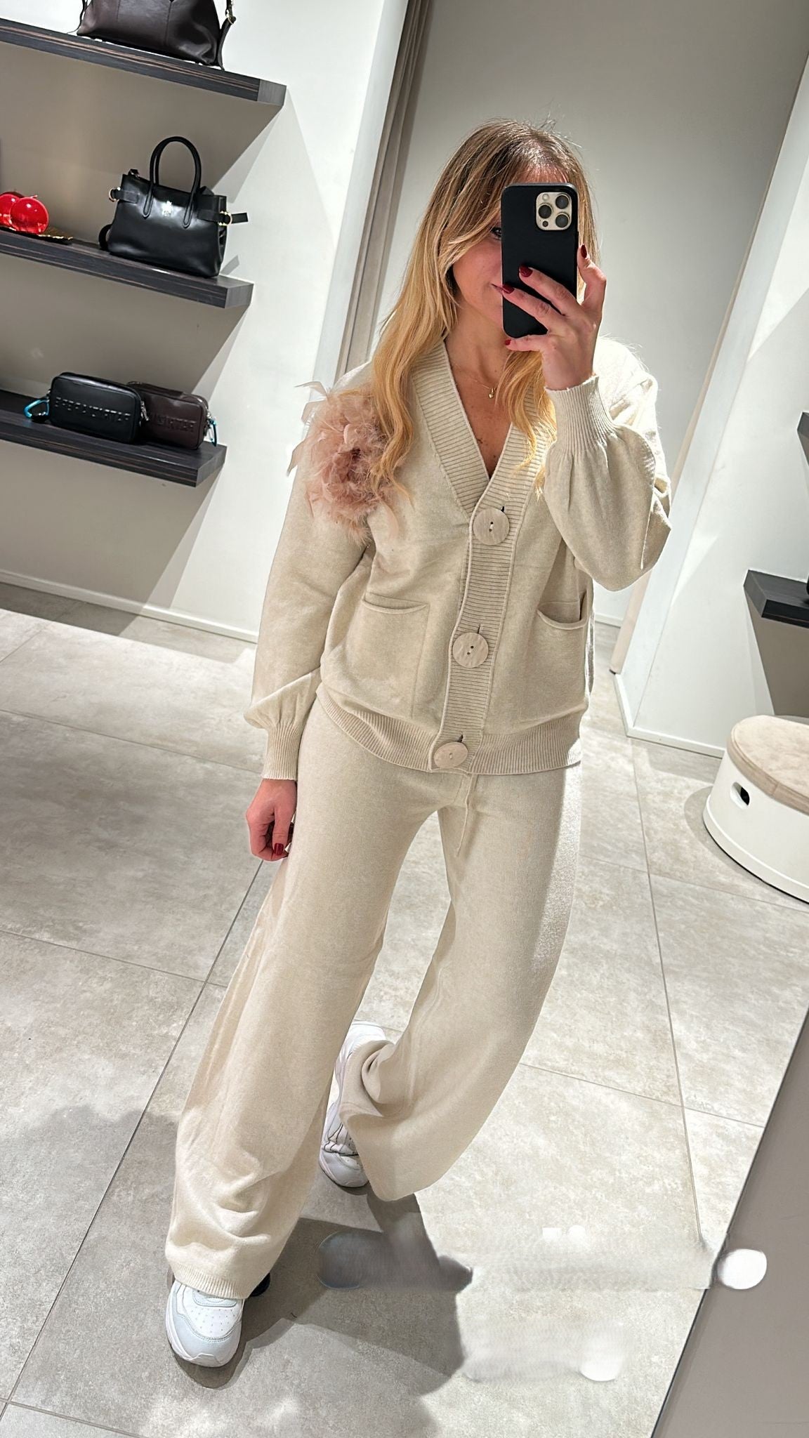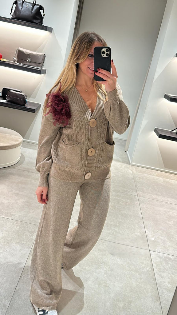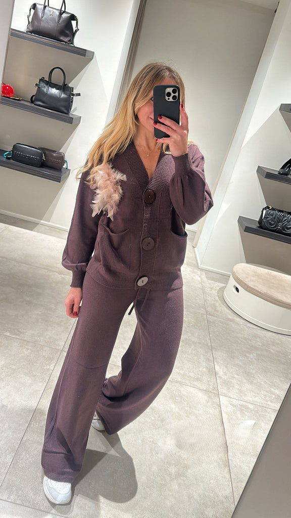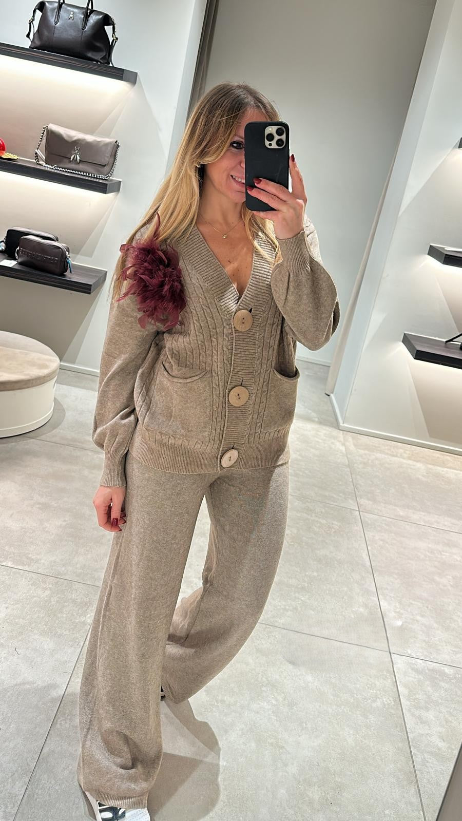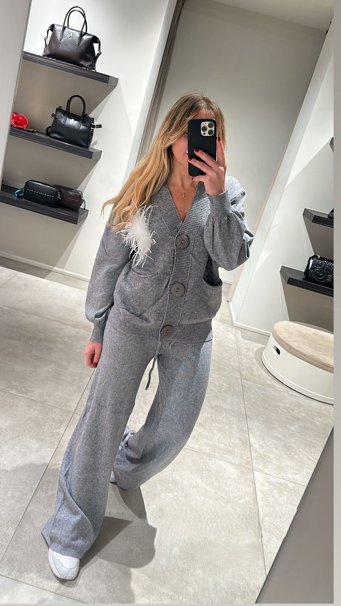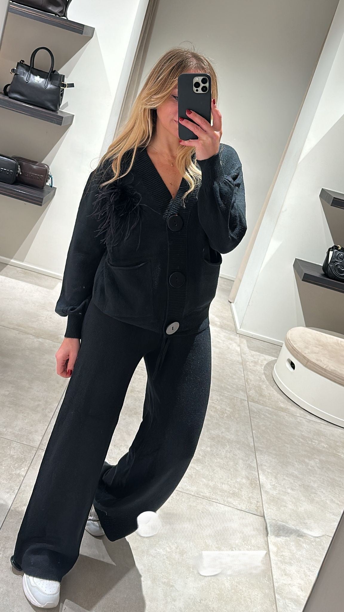 COORDINATO CARDIGAN CON PIUME E PANTALONE
