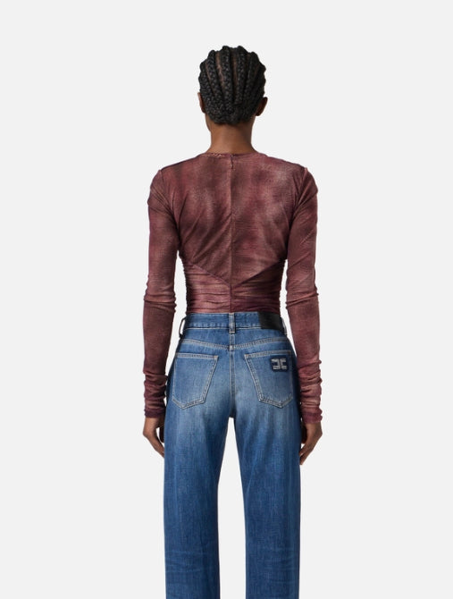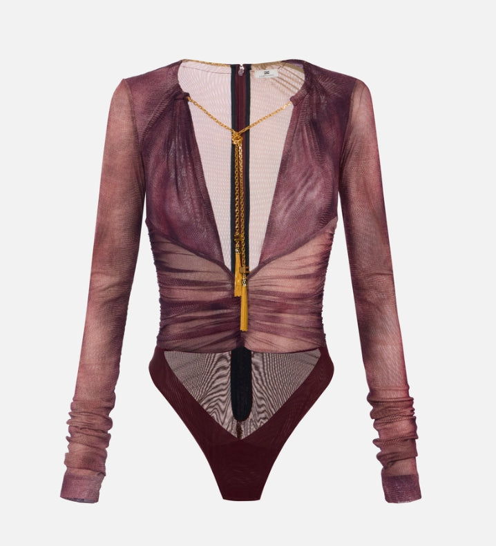 Body in tulle dalla vestibilità aderente. Ha maniche lunghe e girocollo che si apre in un un profondo cut-out, esaltato da arricciature e drappeggi che si ritrovano sul punto vita. La collana in catena con logo e nappine in trama snake è amovibile, per sperimentare più opzioni di styling.