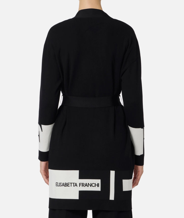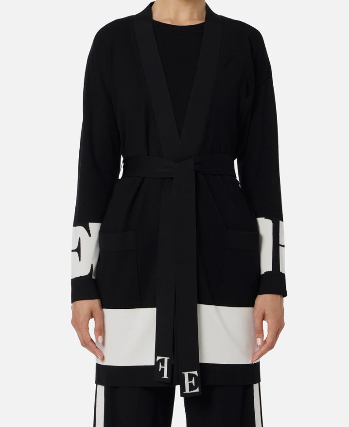 Cardigan a vestaglia in viscosa dalla vestibilità regular. Dalla linea avvolgente, si distingue per i loghi intarsiati in viscosa lucida sulle maniche, sul retro e alle estremità della cintura, a creare dei decisi effetti color-block. Tasche applicate.