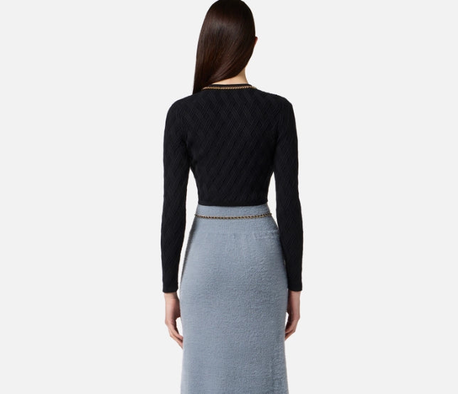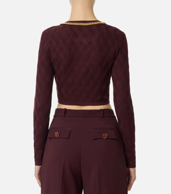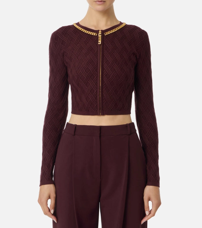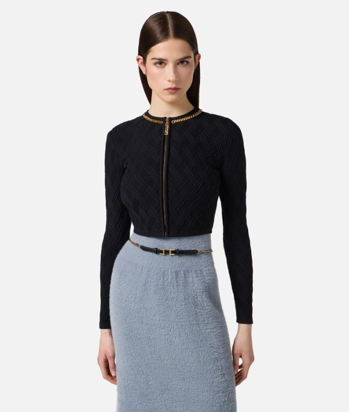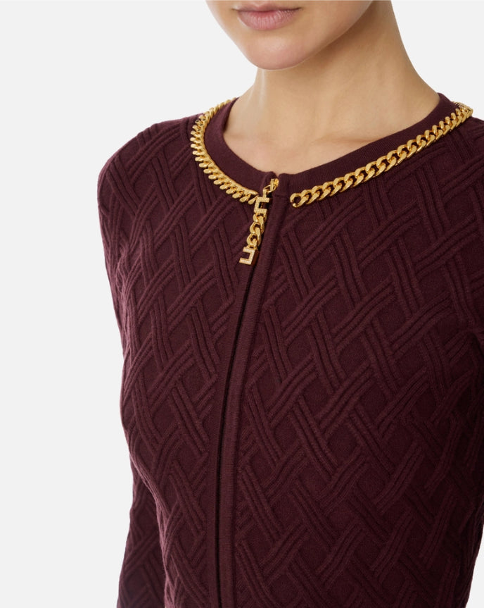 Cardigan in maglia dalla vestibilità aderente. Con girocollo e maniche lunghe, si distingue per l'elaborata lavorazione 3D che crea un disegno geometrico a rombi su tutta la lunghezza. Impreziosito dalla catena con taglio diamantato, ha scollo con zip e tirazip gioiello con logo.