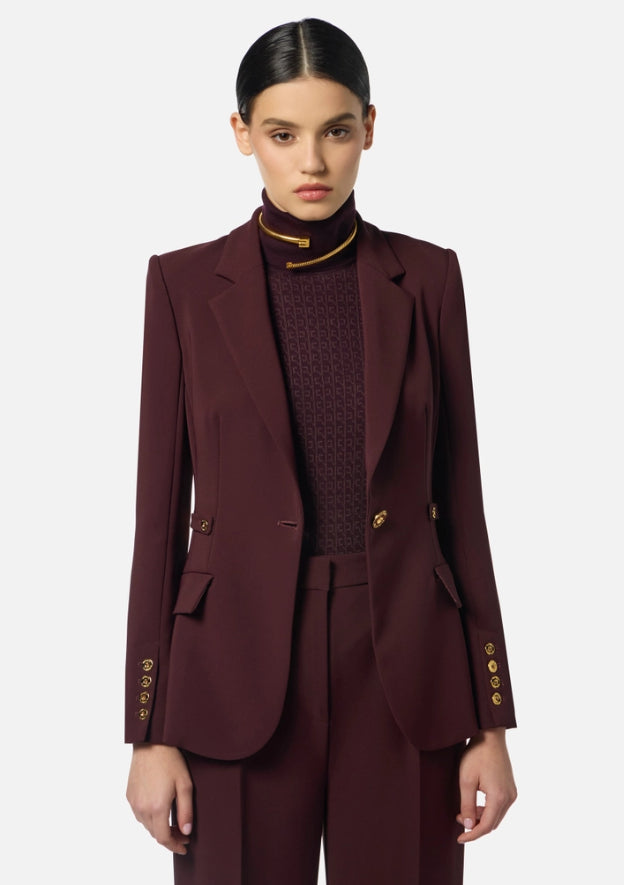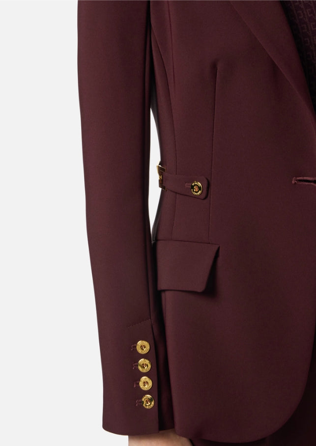 Giacca in crêpe leggero dalla vestibilità slim. Il blazer ha spalle strutturate, rever classico, patte applicate. I fianchi sono impreziositi dall'accessorio gioiello con logo, i bottoni in metallo dorato illuminano il capo.