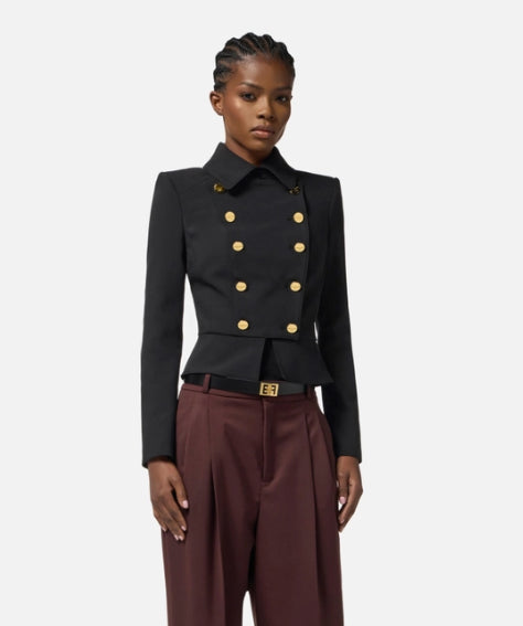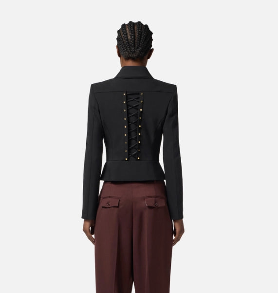 Giacca in tessuto bielastico dalla vestibilità slim. Ha spalle strutturate, colletto a camicia, maniche lunghe. La chiusura doppiopetto è esaltata dalla baschina in vita. I bottoni in metallo dorato regalano dettagli luminosi. Sorprende il retro con un'allacciatura criss-cross sulla schiena.