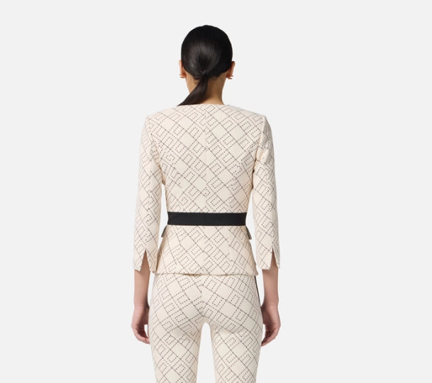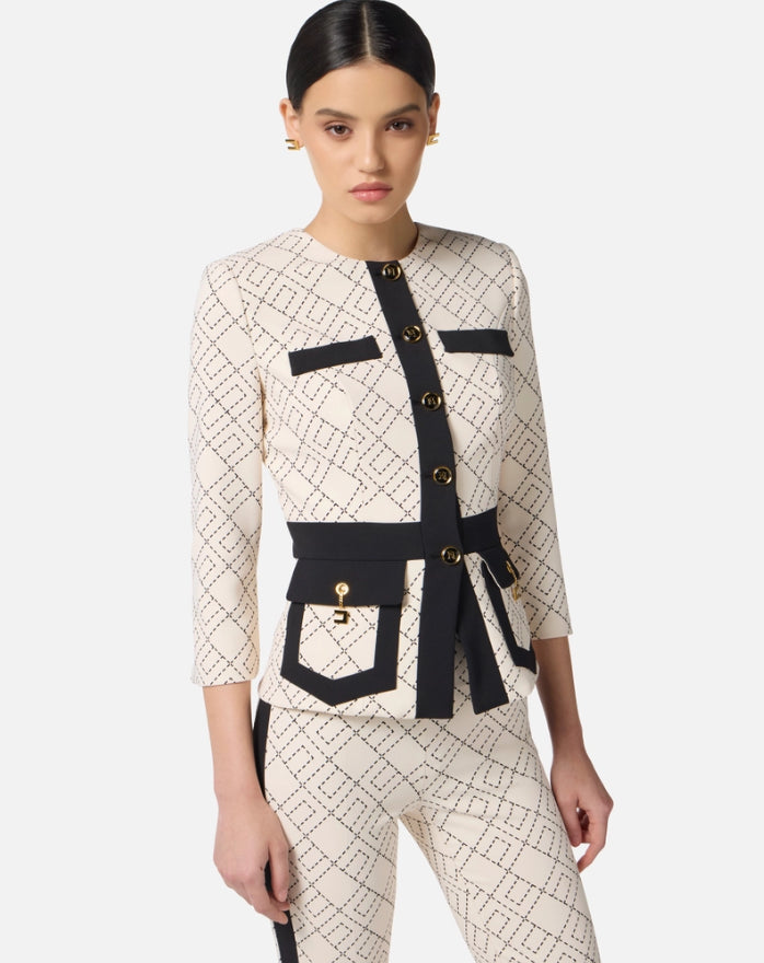 Giacca in doppio crêpe dalla vestibilità aderente con spalle strutturate e maniche 3/4. Si distingue per i giochi bi-color creati dal pattern con logo all-over e i dettagli in colore a contrasto. I gemelli pendenti con catena e i bottoni smaltati con logo aggiungono movimento e luce.