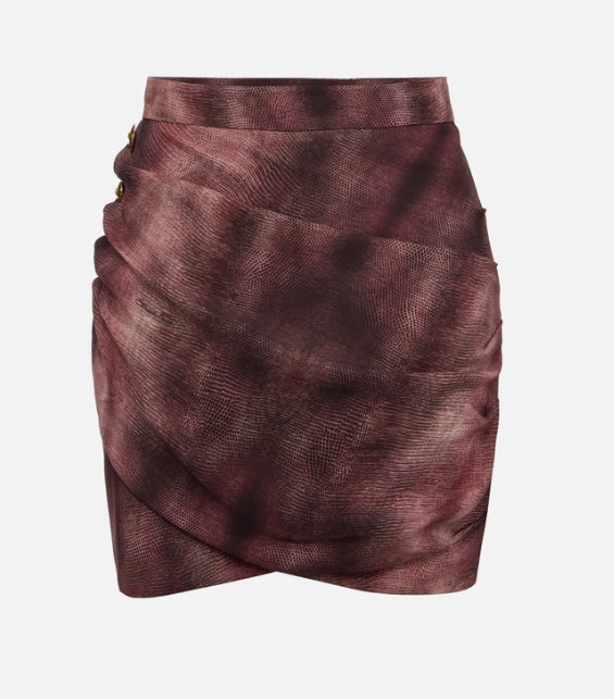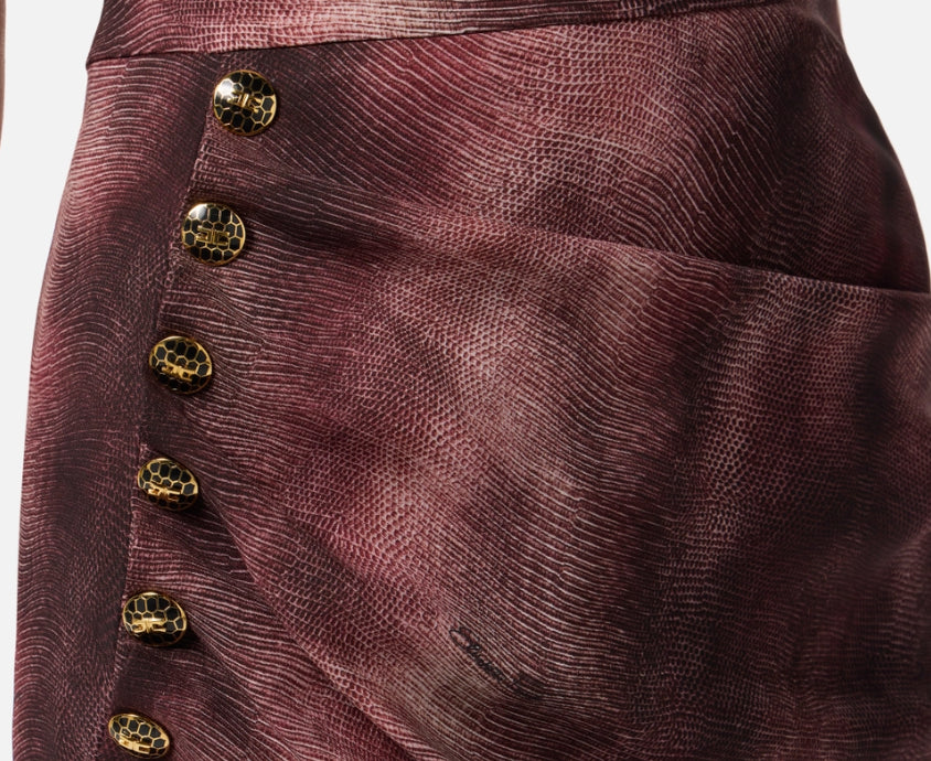 Gonna in crêpe dalla vestibilità aderente. Si distingue per i drappeggi che donano movimento al capo, trattenuti da un lato da bottoni smaltati con pattern di ispirazione snake. Protagonista è la stampa con fantasia pitone, ingentilita da ipnotiche sfumature.