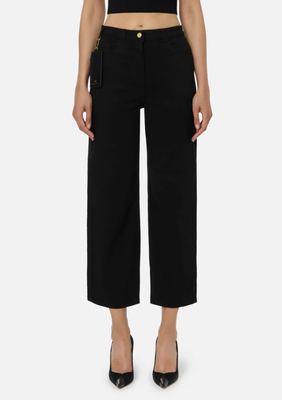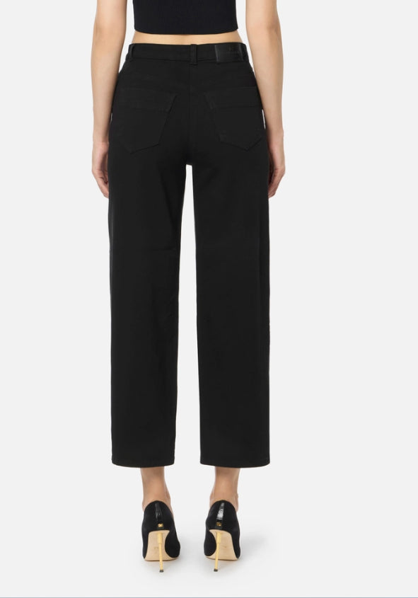 Pantaloni in denim drill di cotone con costruzione boyfriend a vita alta, gamba larga e lunghezza alla caviglia. Il dettaglio di stile è il passante decentrato, arricchito dalla pouch con zip e trattenuta dal moschettone in metallo dorato con logo. L'etichetta sul retro completa il capo. Vestibilità regular.