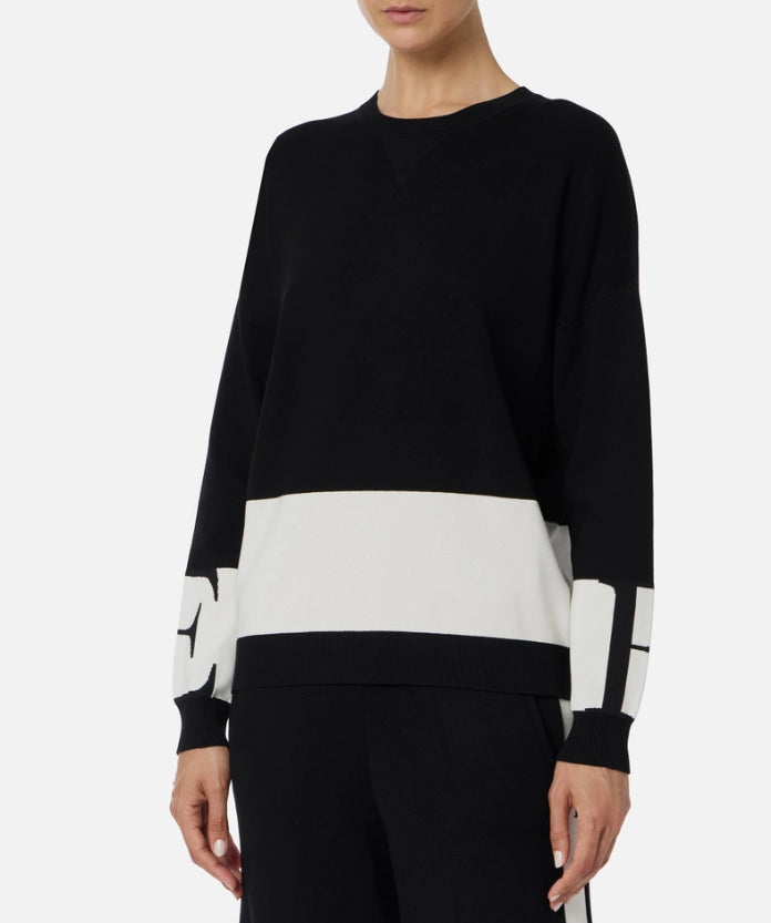 Maglia in viscosa dalla vestibilità regular. Con girocollo ampio, si distingue per i loghi intarsiati in viscosa lucida sulle maniche e sul retro, a creare dei decisi effetti color-block.