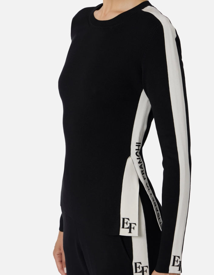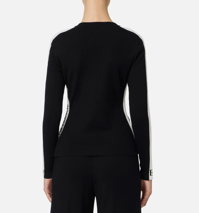 Maglia in viscosa dalla vestibilità aderente. Con girocollo e maniche lunghe, è impreziosita dalle bande rifinite in viscosa lucida per un elegante contrasto di texture. Con loghi intarsiati in colori a contrasto per un sapore grafico, ha spacco laterale che rivela un ultimo dettaglio logo.