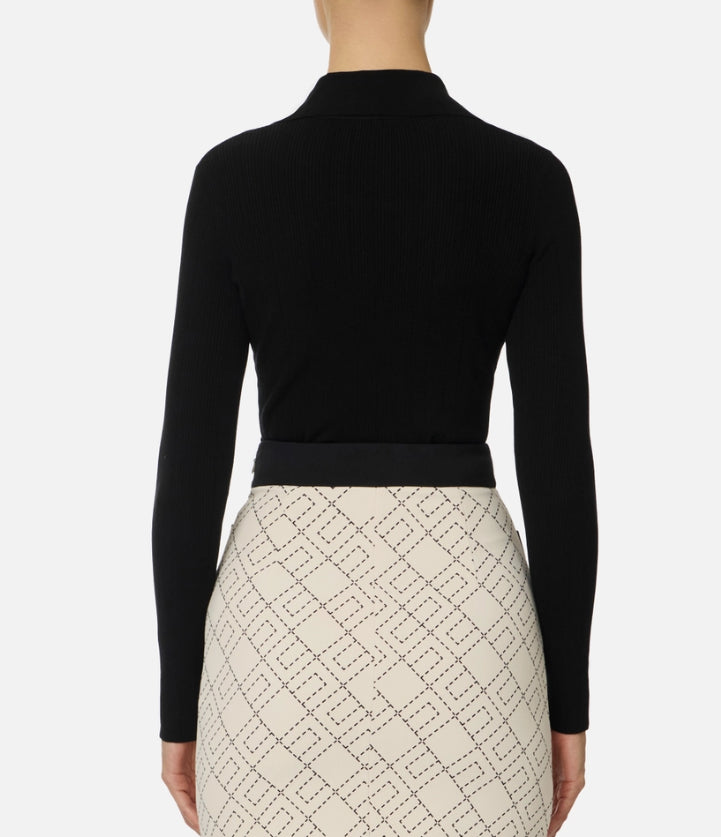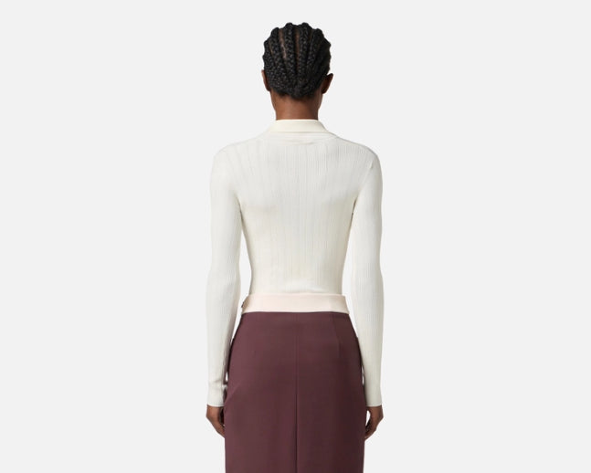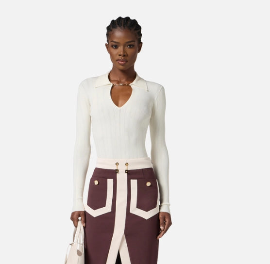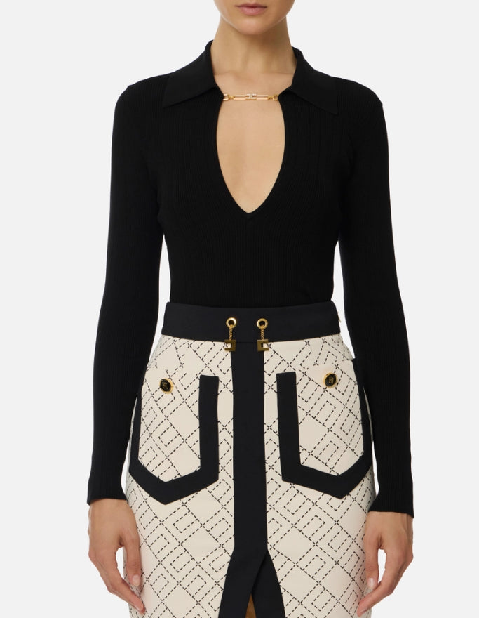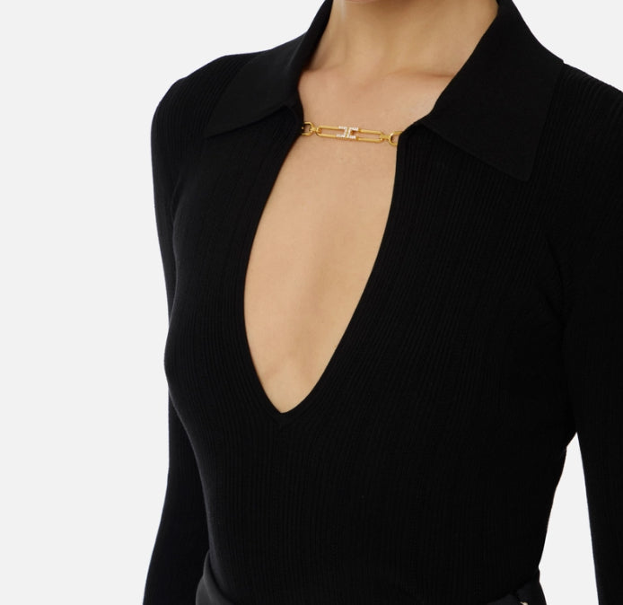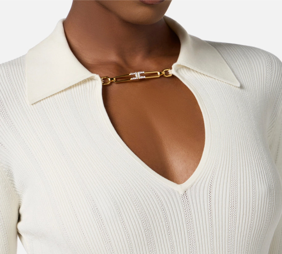 Maglia a costine dalla vestibilità aderente. Con colletto a polo e scollo a V, è impreziosita dall'accessorio gioiello in metallo dorato con logo e strass. La trama è ingentilita dai ricami à jour che regalano definizione e morbidezza.