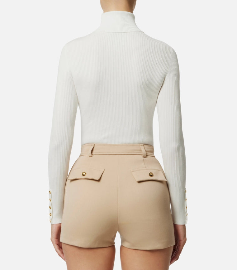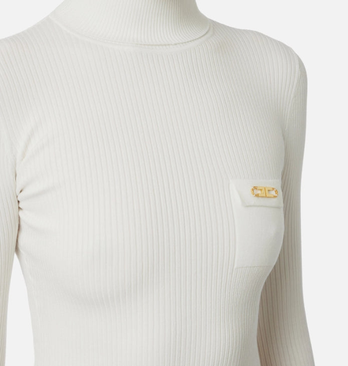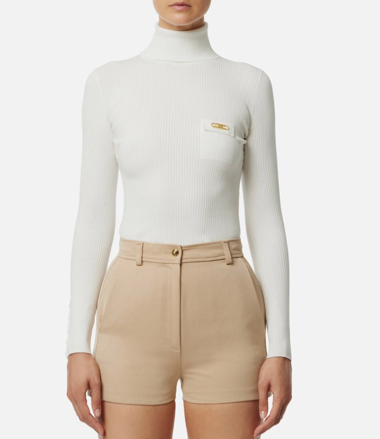 Maglia a costine dalla vestibilità aderente. Con collo dolcevita e maniche con bottoni al fondo, è personalizzata dal taschino in raso con dettaglio logo che regala una nota di luce.