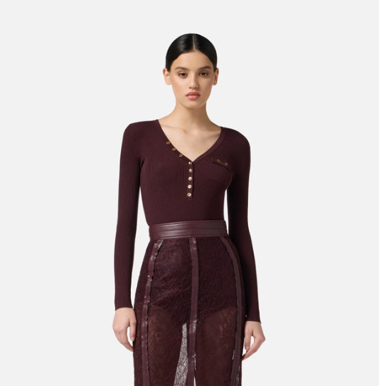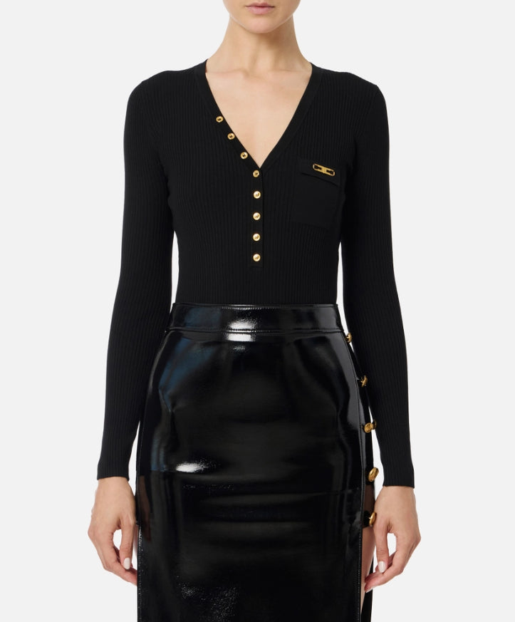 Maglia a costine dalla vestibilità aderente. Con scollo a V arricchito da bottoni e maniche lunghe, è personalizzata dal taschino in raso con dettaglio logo che regala una nota di luce.