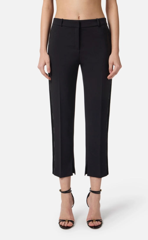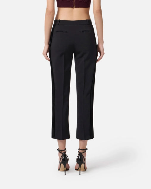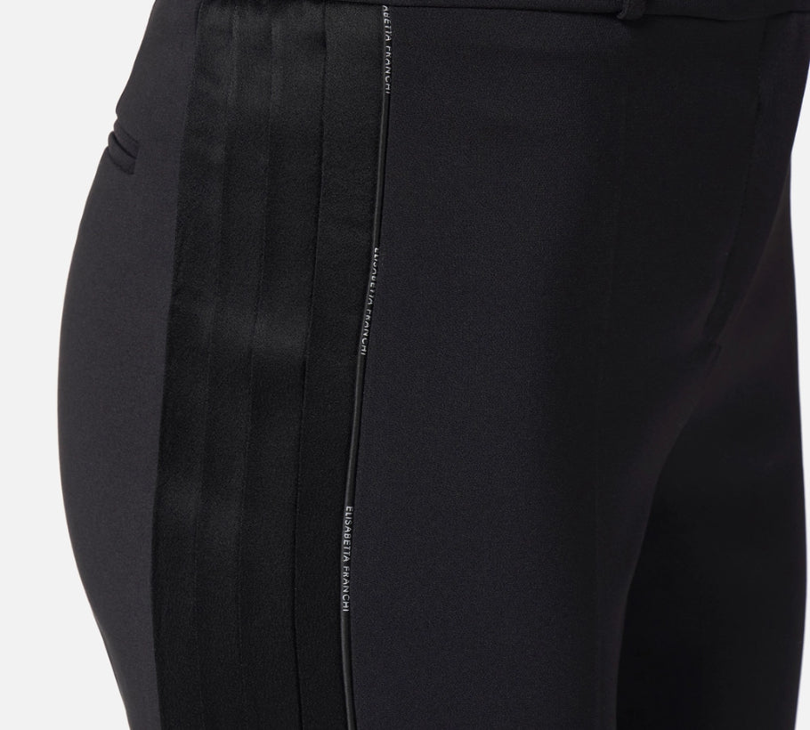 Pantaloni in crêpe dalla vestibilità slim. Si distinguono per la pieghettatura in raso di ispirazione smoking e il piping con logo lungo i fianchi, per un interessante gioco di contrasti. Cintone con passanti, filetti sul retro.