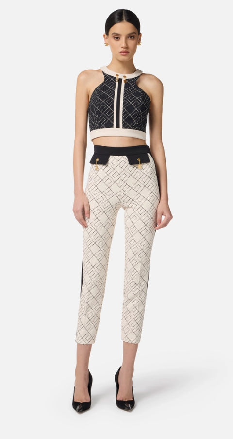 Pantaloni in doppio crêpe dalla vestibilità aderente. Si distinguono per i giochi bi-color creati dal pattern stampato con logo all-over e i dettagli in colore a contrasto come il fascione, le patte e le bande laterali. I gemelli pendenti con catena aggiungono un dettaglio luminoso.