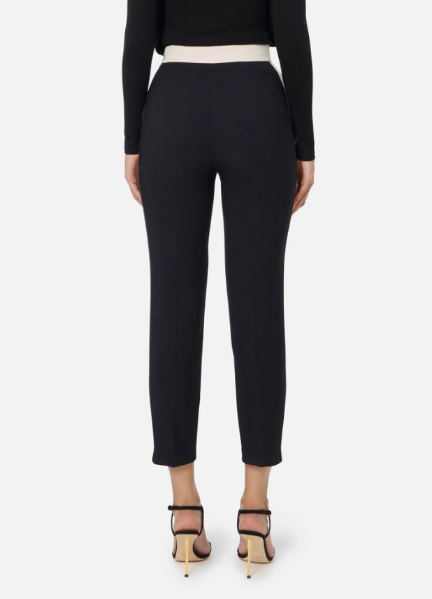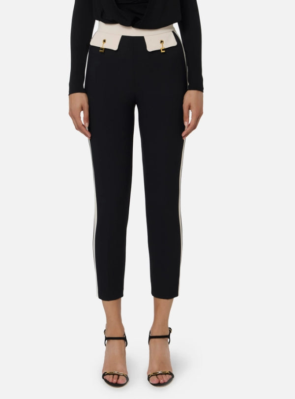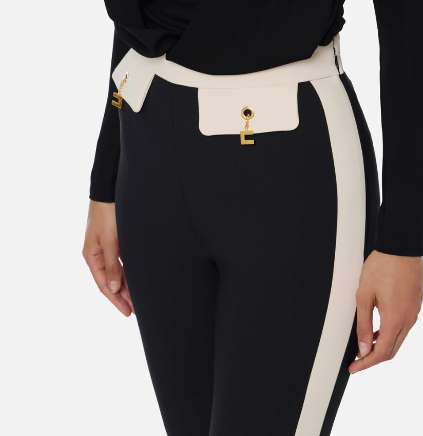 Pantaloni in doppio crêpe dalla vestibilità aderente. Con lunghezza alla caviglia, si distinguono per i dettagli in colore a contrasto che creano un raffinato equilibrio cromatico come il fascione, le patte e le bande laterali. I gemelli pendenti con catena aggiungono un dettaglio luminoso.