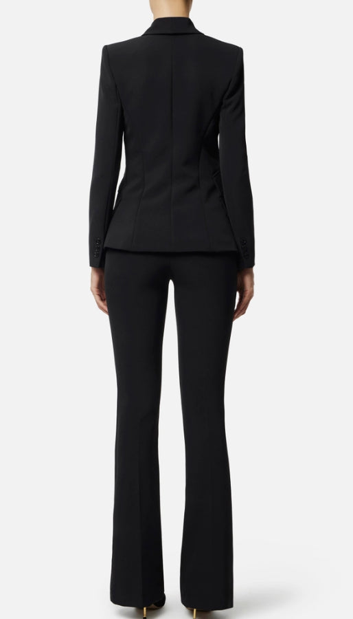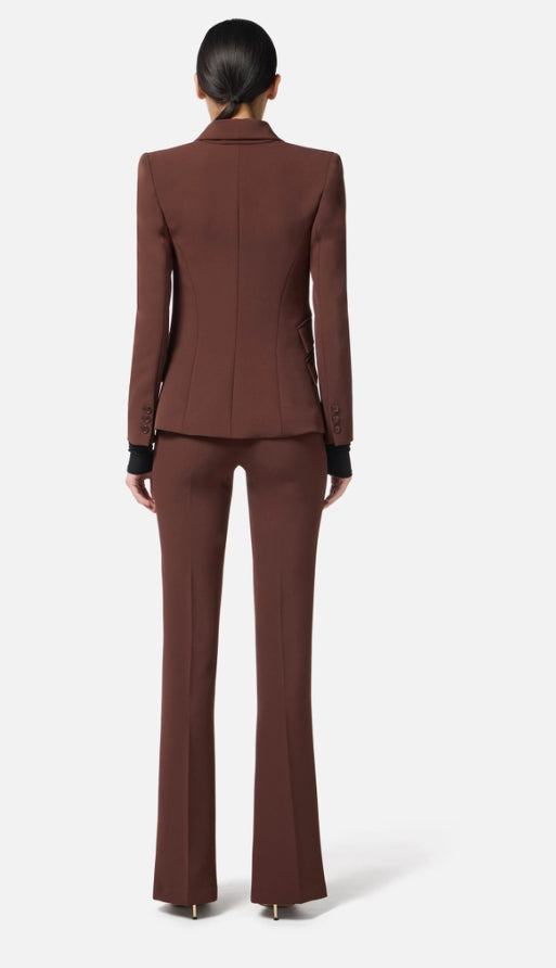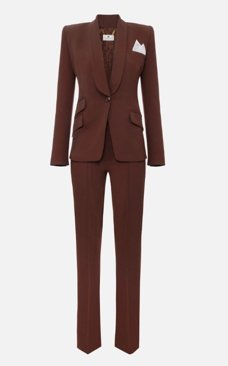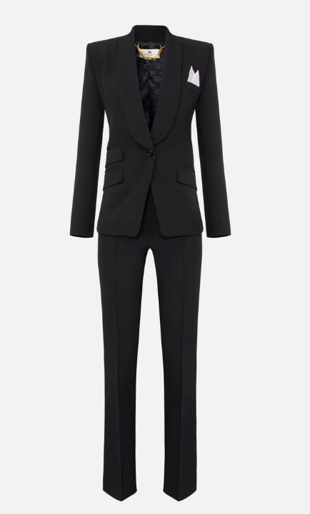 Tailleur monopetto in crêpe composto di giacca e pantaloni. Il blazer ha spalle strutturate, collo sciallato, patte, taschino con pochette in popeline di cotone dal logo ricamato. I pantaloni hanno linea svasata al fondo e si distinguono per il nastro con logo che decora il fascione. Vestibilità slim.