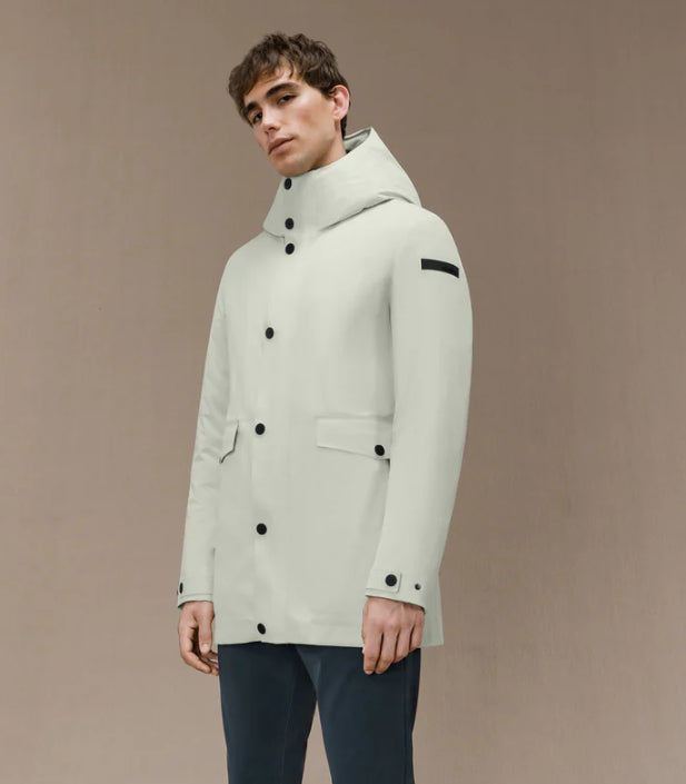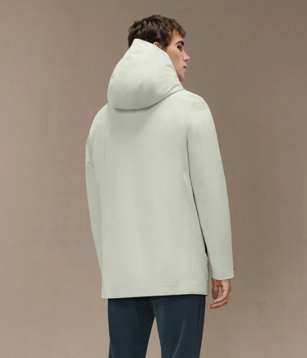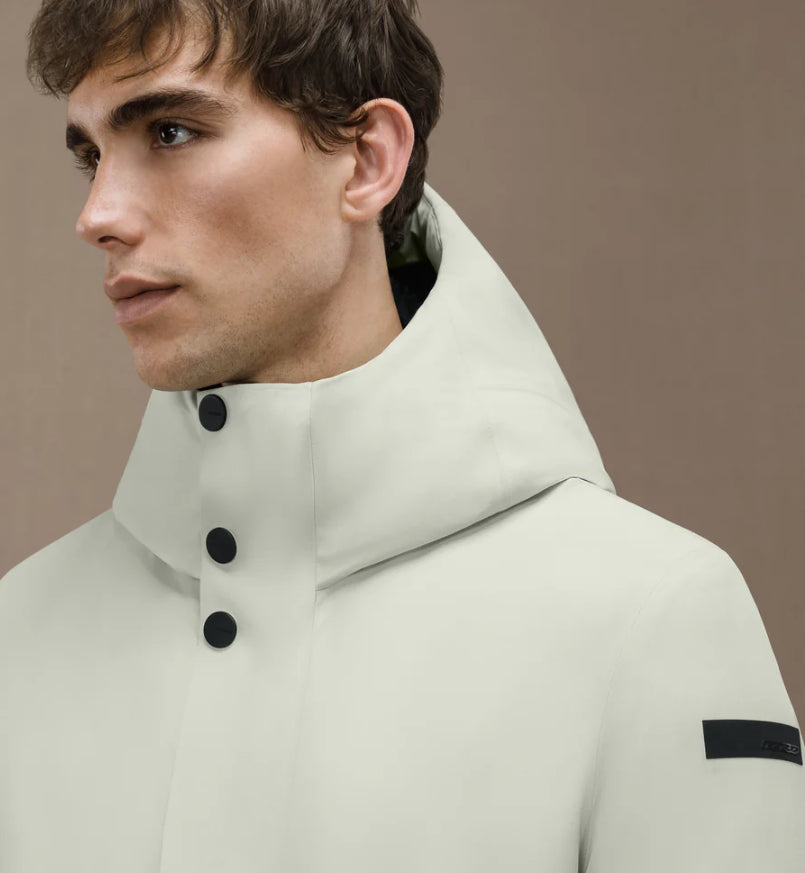 Il parka entra in una dimensione di inedita eleganza, puntando su uno styling nitido che affianca dettagli evocativi al design razionale ispirato all'oceano, in un'eterogenea palette di tonalità sobrie. Il tessuto a membrana Stratofabric#3 stretch e traspirante e il sistema di termonastrature interne rendono il capo totalmente impermeabile. Lo shell esterno è leggerissimo e morbido al tatto, dal feeling unico. I bottoni soft touch contrappuntano il look super opaco sulla patta centrale, che nasconde la zip a doppio cursore e sale a chiudere il cappuccio avvolgente. Il parka dispone di tasche laterali multiple, chiuse da toppe abbottonate e zip termonastrate. I bottoni soft touch regolano anche i cinturini ai polsi. L'imbottitura con tecnologia Floating Shield in tubico “square” termosaldato privo di impunture e aggiunge una vestibilità impeccabile al calore e al comfort delle piume d'anatra 90/10. L'interno è dotato di taschino a zip con tag a cuore "Made with love, designed in Tuscany". Logo nero a microiniezione sulla manica sinistra.